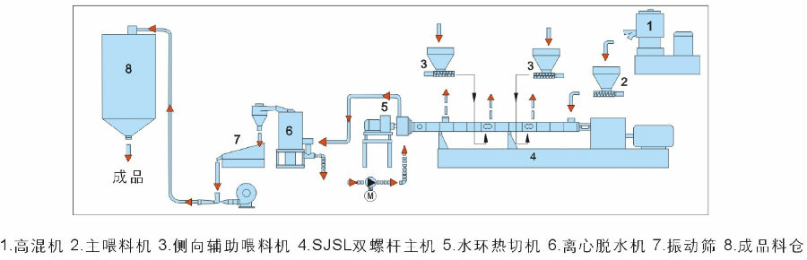 1、EVA、SBS類彈性體造粒機(jī):EVA、SBS類具有優(yōu)異的回彈性能,廣泛用于各類包裝、建筑、工具、密封等產(chǎn)業(yè)中。通過雙螺桿混煉造粒后更具有各種優(yōu)異的特殊性能,采用水環(huán)模面或水下切粒方式是其理想的選擇。